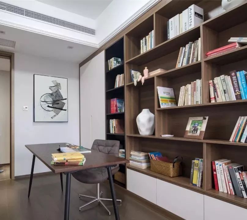 书房做了书桌加上满墙书柜的设计,如果有需要可以把在书房内布置一张床,把书房给变成客房,轻便的书桌移动起来也很方便。